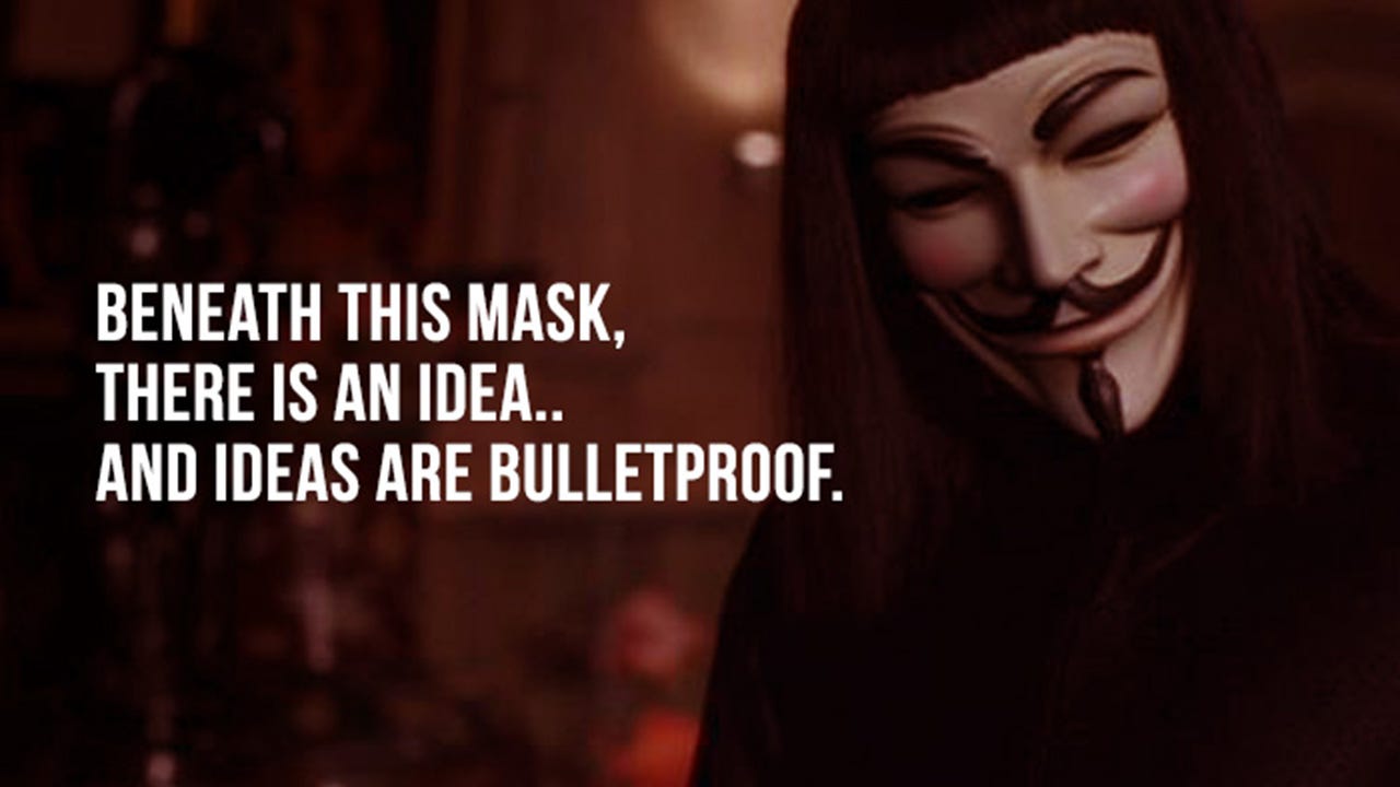 After his death towards the climax, Evey wrestles over the choice of whether or not she should remove his mask, to see the person underneath. Ultimately, she decides against it, for some part of her realizes that by knowing the person, she would be reducing what V represented to a lesser plane. V has to remain an idea, one to be followed, to be emulated, and if need be recreated.